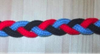 Machine or hand method of interlacing three or more yarns or cloth strips in such a way that they cross one another and are laid together in diagonal formation, forming a narrow strip of flat or tubular fabric. | Trenzado | Afrikāņu bizītes